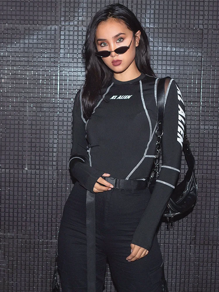 - Bas : Associez-le avec un legging noir déchiré, un pantalon cargo technique aux poches multiples ou un short en vinyle pour renforcer l’aspect cyber futuriste.