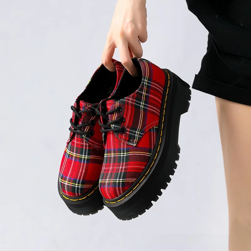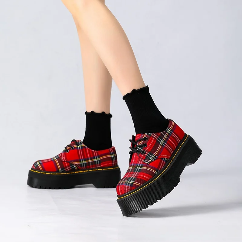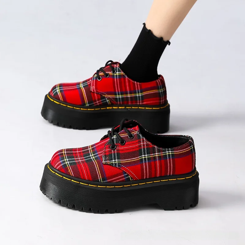 Découvrez les chaussures plateforme à lacets motif tartan rouge, l’audace incarnée pour votre garde-robe. Ce modèle unique allie l’énergie vibrante du tartan écossais à une silhouette surélevée, offrant un look à la fois rétro et résolument moderne. Parfaites pour affirmer votre style, ces chaussures apportent une touque punk-chic et une hauteur flatteuse à toutes vos tenues, des jeans délavés aux robes les plus élégantes. Leur design détaillé et leur confort assuré font de chaque pas une déclaration de mode puissante et confortable.