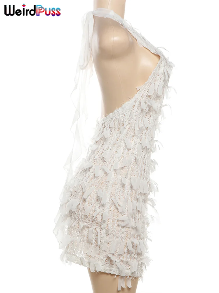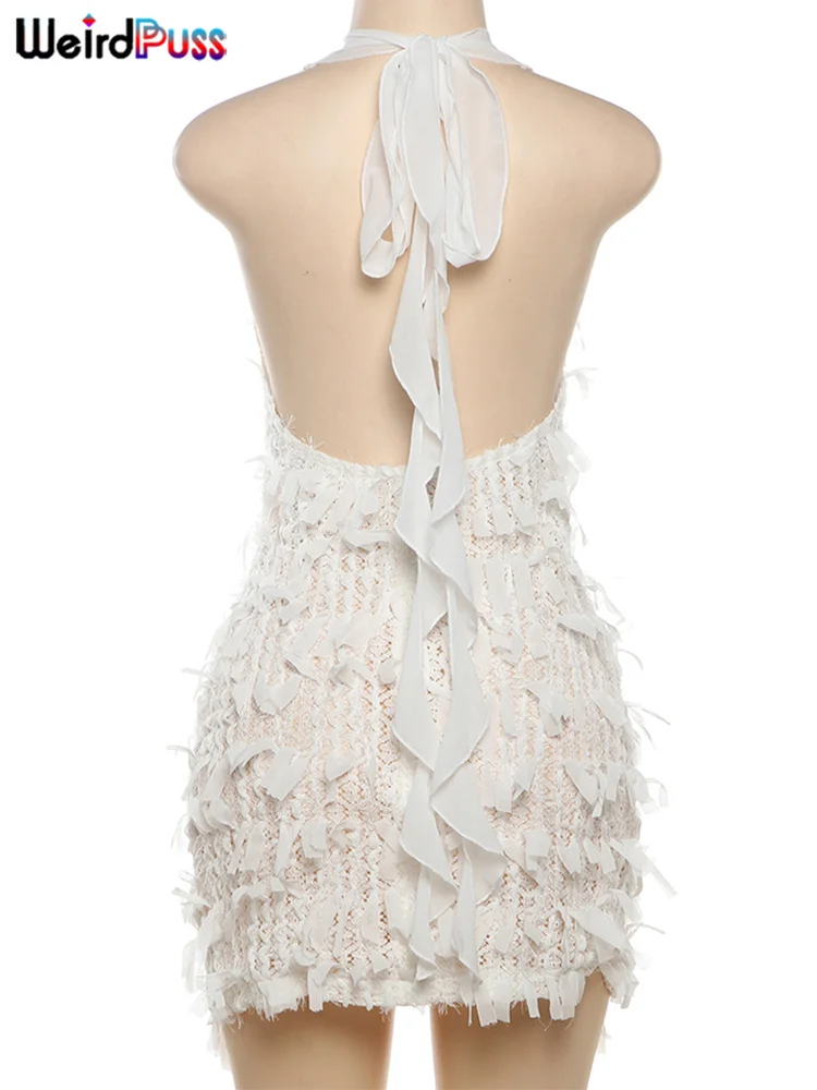 Robe courte dos-nu en dentelle à franges à décolleté plongeant