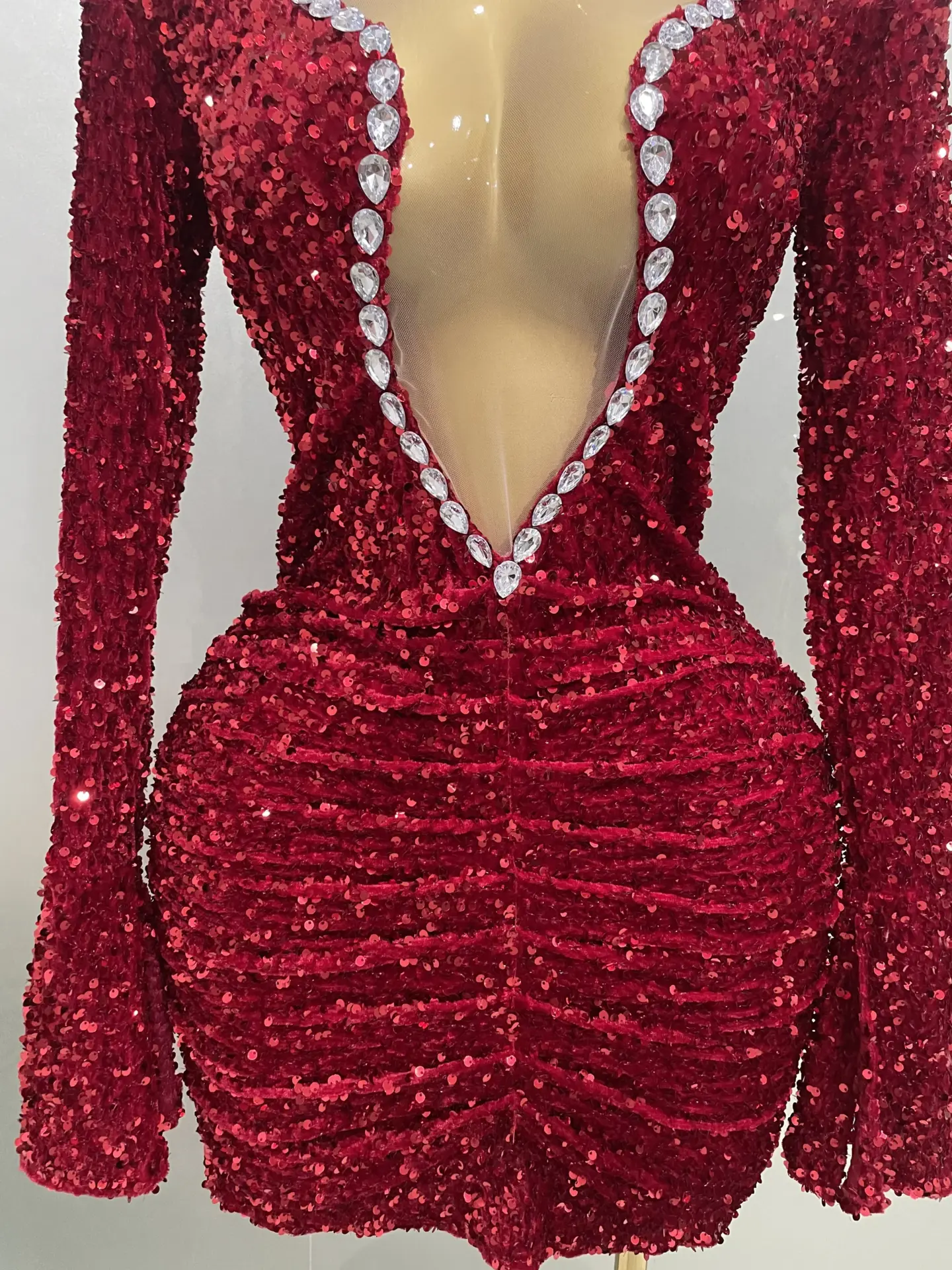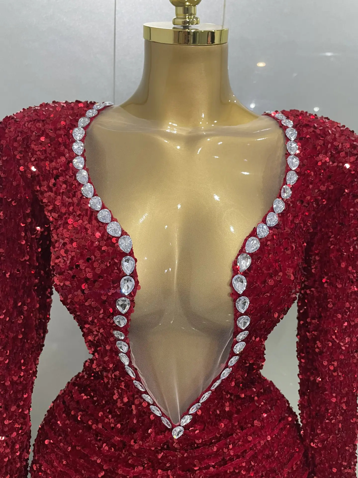 Robe moulante à sequins rouges avec décolleté plongeant et strass